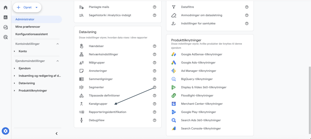 I GA4 oprettes channel groups under Admin → Channel groups (kanalgrupper på dansk). Her kan du definere en ny channel group, eksempelvis med navnet LLM / AI assistenter.