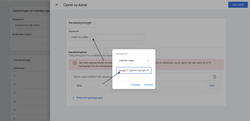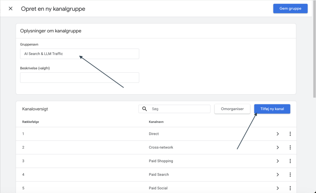 Giv den et navn f.eks. AI Search & LLM Traffic og tilføj ny kanal