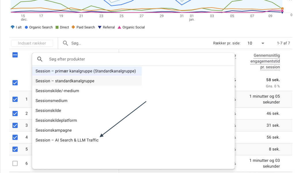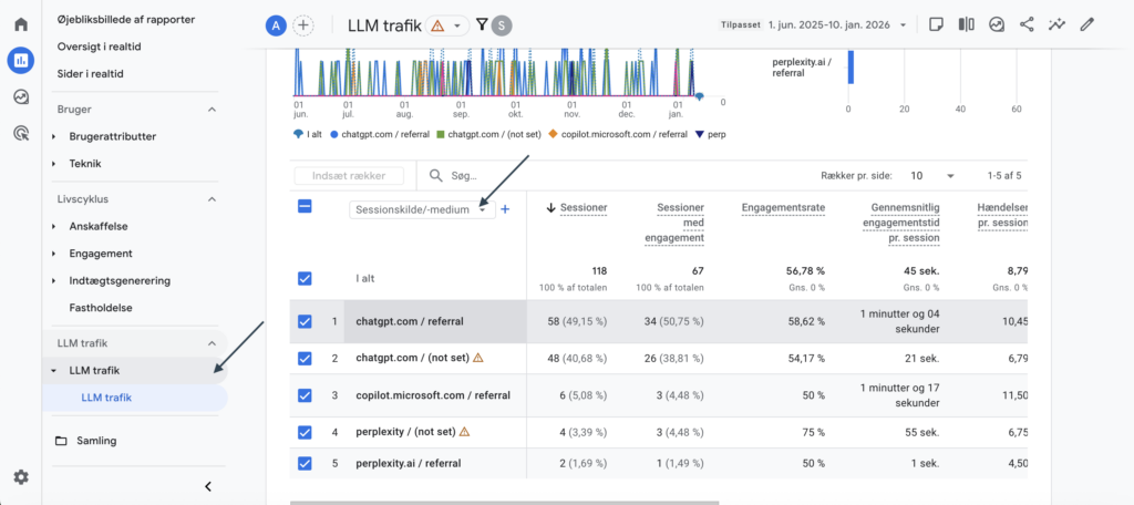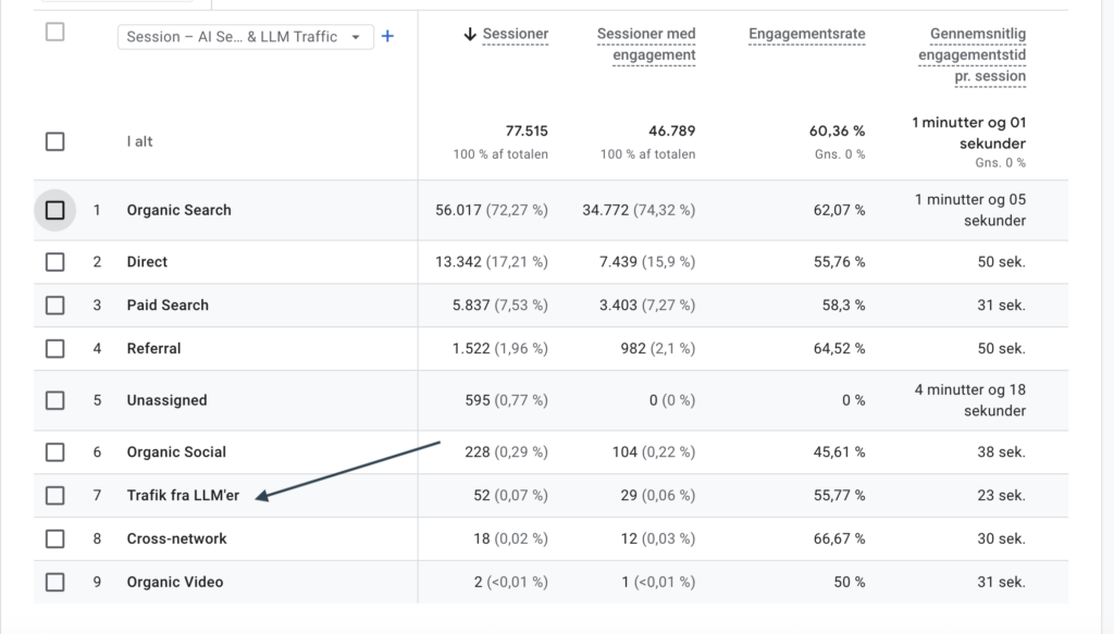 Det gør det muligt at analysere sessions, engagement og eventuelle konverteringer fra AI-kilder på samme niveau som andre trafiktyper.
