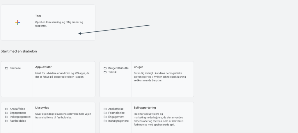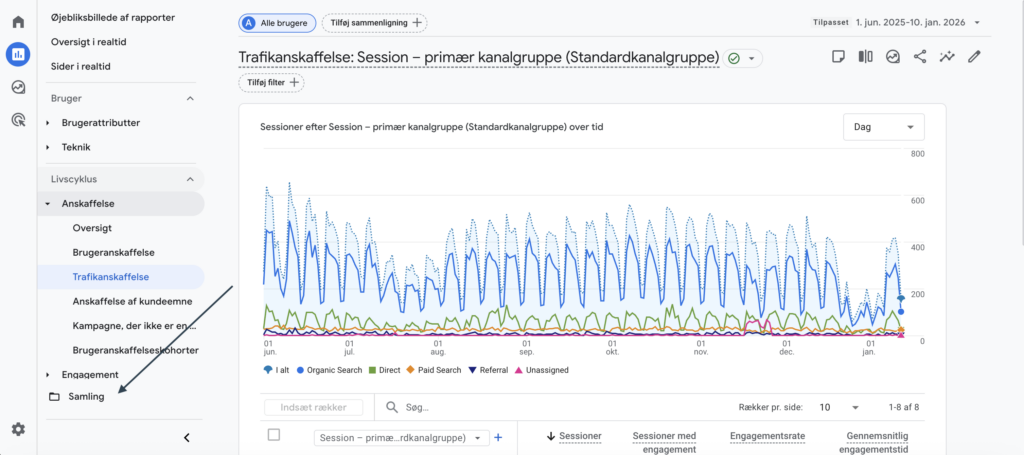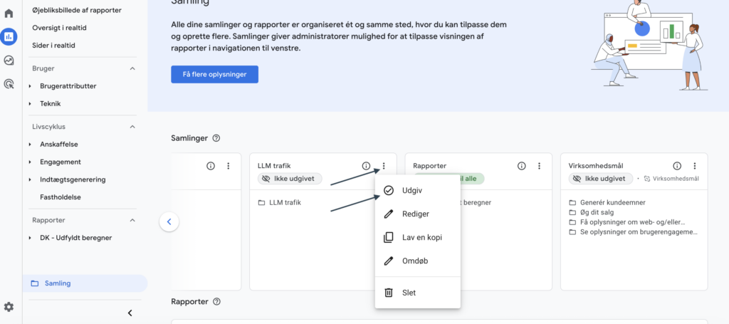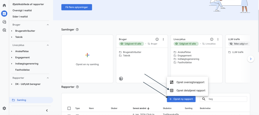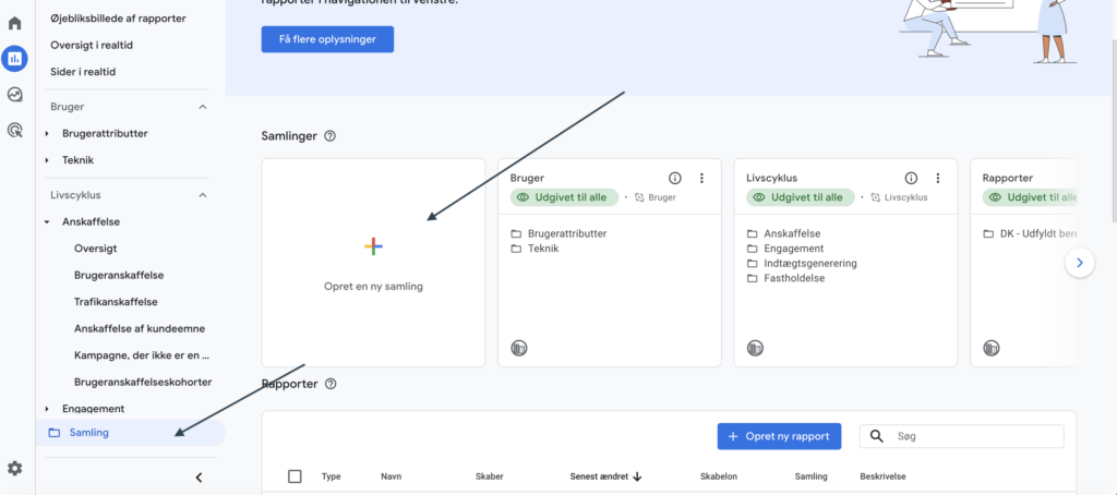 For at gøre rapporteringen mere overskuelig (særligt i samarbejde med kunder eller interne stakeholders), kan rapporten tilføjes til en dedikeret Samling (Collection) i GA4.