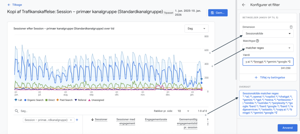 Ved at samle disse kilder i én kanal opnår du et klart overblik over den trafik, der kan relateres til AI-assisteret søgning.