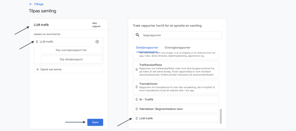 Giv samlingen og oversigten et navn og træk din nye rapport ind i samlingen og gem denne.